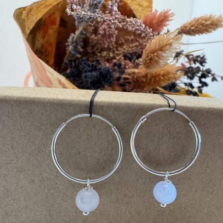 Aquestes arracades estan creades amb un aro de plata de 20 mm i una petita boleta de quars natural, una pedra coneguda per la seva transparència i puresa.