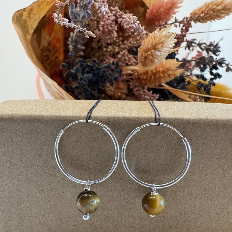 Formades per un aro de plata de 20 mm i una petita boleta d’ull de tigre, aquesta joia destaca pels seus tons daurats i marrons, plens de caràcter.